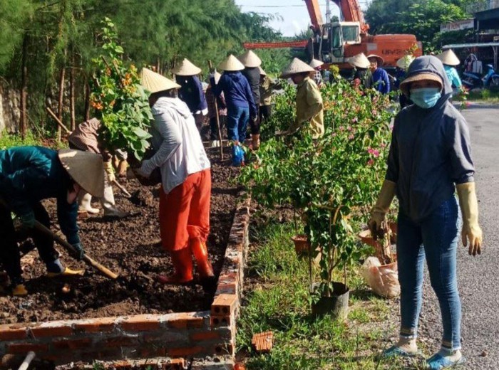 Nhân dân thôn Ninh Hải, xã Minh Châu, chung sức xây dựng tuyến đường hoa giấy dọc trục đường vào thôn.