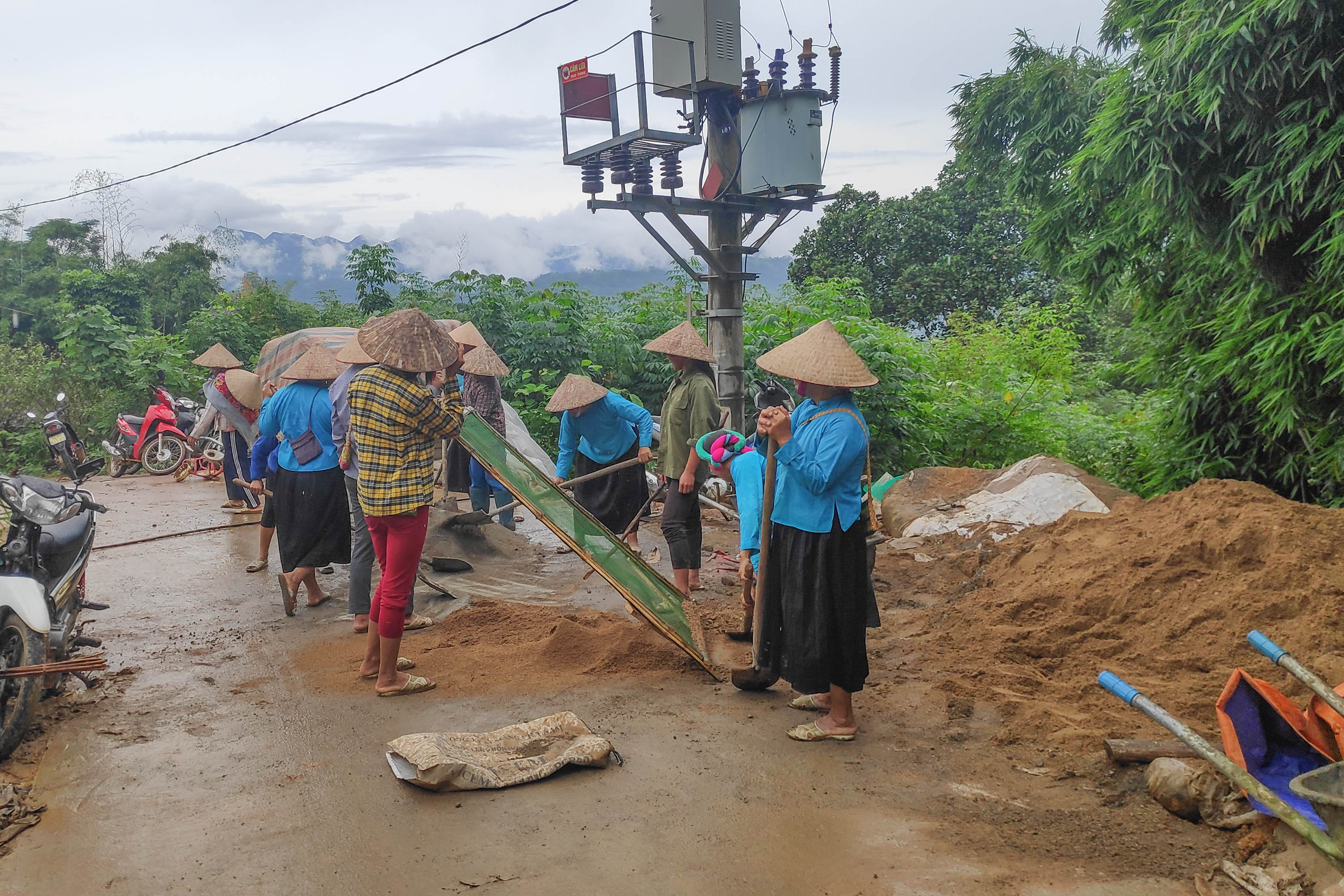 Người dân thôn Ngàn Pạt (xã Lục Hồn, huyện Bình Liêu) tham gia bê tông hóa đường giao thông ngõ xóm.