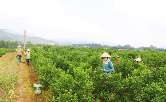 Người dân xã Bình Khê (TX Đông Triều) canh tác trên diện tích sản xuất tập trung chuyên canh cây ăn quả.