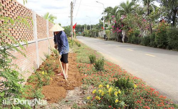 Người dân trồng hoa, chăm sóc hằng ngày cho tuyến đường sáng - xanh - sạch - đẹp tại xã Tân Bình (H.Vĩnh Cửu). Ảnh: Bình Nguyên
