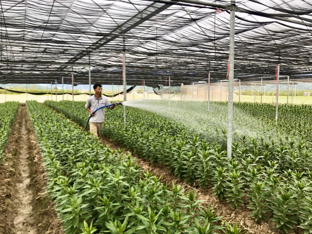 Anh Vũ Xuân Đương, thôn Quảng Mản, xã Bình Khê, TX Đông Triều chăm sóc vườn trồng hoa ly.