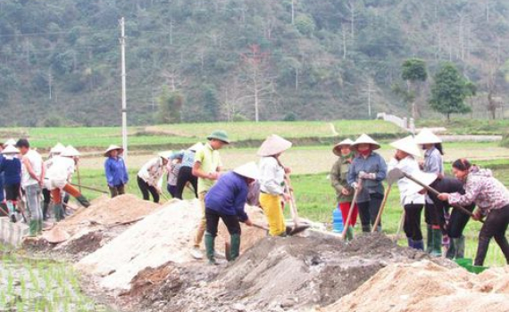 Người dân thôn Làng Cúng, xã Đạo Đức, huyện Vị Xuyên (Hà Giang) làm đường bê tông nội đồng. Ảnh: Nguyễn Phương.