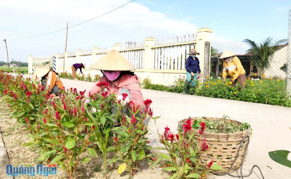 Phụ nữ thôn Xuân Yên Tây, xã Bình Hiệp (Bình Sơn) chăm sóc tuyến đường hoa.