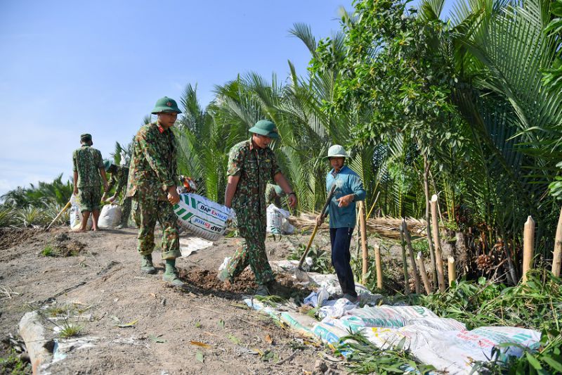 Cán bộ, chiến sĩ Tiểu đoàn 207, Trung đoàn 893 thuộc Bộ chỉ huy quân sự tỉnh Kiên Giang xây dựng lộ GTNT xã Phong Đông, huyện U Minh Thượng (Kiên Giang). (Ảnh: Phương Vũ)