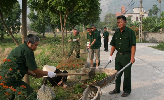 Hội viên Cựu chiến binh thôn Do Lễ, xã Liên Sơn huyện Kim Bảng tham gia chăm sóc đường hoa, cây xanh. Ảnh: Kiều Loan.