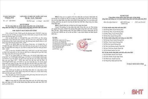 Trước đó, ngày 28/6/2022, Hội đồng thẩm định tỉnh Hà Tĩnh đã bỏ phiếu đánh giá, công nhận 4 xã đạt chuẩn nông thôn mới (NTM), 6 xã đạt chuẩn NTM nâng cao, 4 xã đạt chuẩn MTM kiểu mẫu theo đề xuất với 100% số phiếu đồng ý.