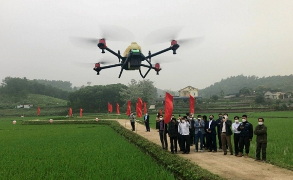 Trình diễn sử dụng máy bay không người lái phun thuốc bảo vệ thực vật tại Thái Nguyên.