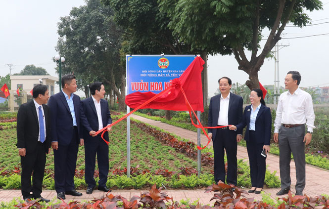 Lãnh đạo Trung ương Hội Nông dân Việt Nam và thành phố Hà Nội gắn biển công trình Vườn hoa nông dân tại xã Yên Viên, huyện Gia Lâm
