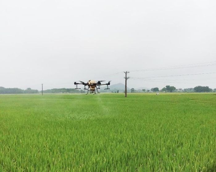 Thiết bị bay không người lái phun thuốc bảo vệ thực vật tại một số xã trên địa bàn huyện Vĩnh Lộc.