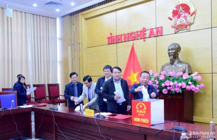 Các thành viên Hội đồng thẩm định NTM tỉnh bỏ phiếu công nhận các xã về đích NTM và NTM nâng cao. Ảnh: Xuân Hoàng