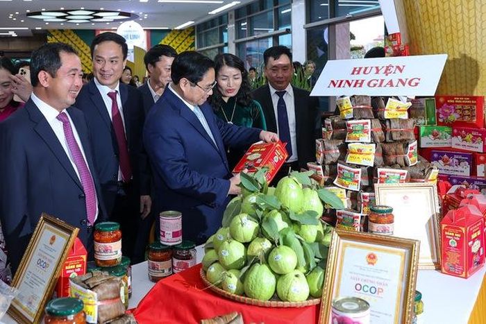 Thủ tướng tham quan gian hàng với các sản phẩm nông nghiệp đặc trưng, sản phẩm OCOP của tỉnh Hải Dương - Ảnh: VGP/Nhật Bắc