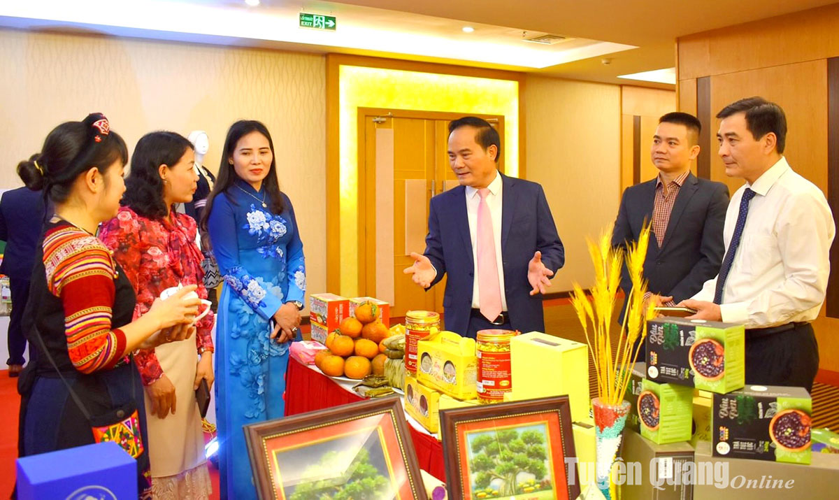 Đồng chí Phó Chủ tịch UBND tỉnh Hoàng Việt Phương và các đại biểu tham quan khu trưng bày giới thiệu tiềm năng đầu tư thương mại và du lịch của tỉnh tại Hội nghị truyền thông về Khai mạc Năm Du lịch Tuyên Quang tại Đà Nẵng tháng 3-2024.