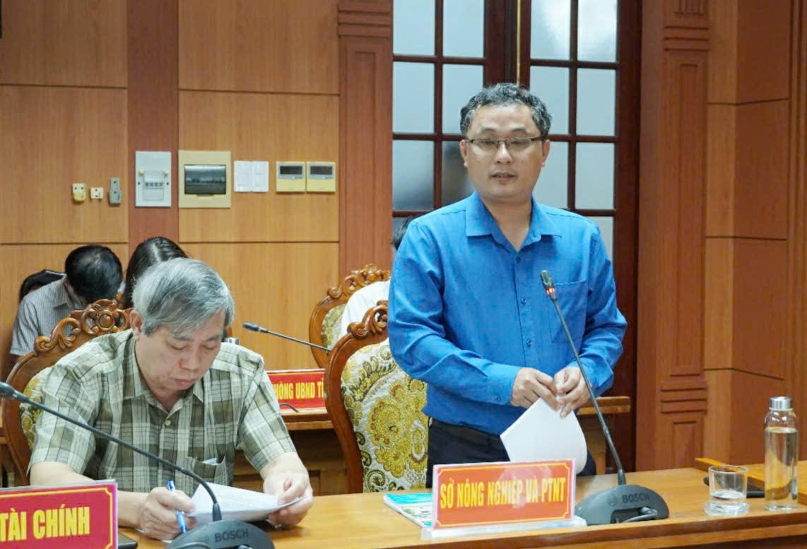Ông Nguyễn Xuân Vũ - Phó Giám đốc Sở NN&PTNT kiêm Chánh Văn phòng Điều phối NTM tỉnh Quảng Nam báo cáo tại cuộc họp. Ảnh: NHÃ PHƯƠNG