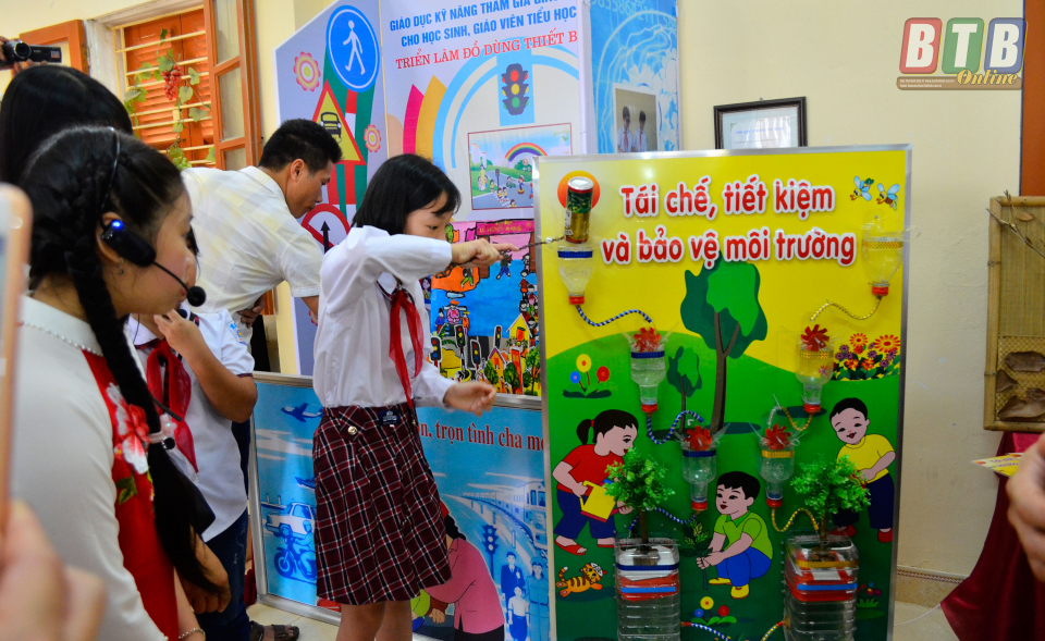 Học sinh hào hứng thực hành sản phẩm tái chế, tiết kiệm và bảo vệ môi trường.