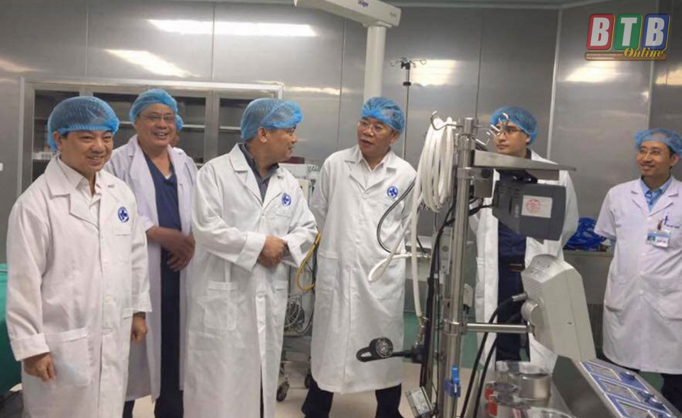 Các đồng chí lãnh đạo Sở Y tế và các chuyên gia đến từ Bệnh viện E kiểm tra hệ thống phòng mổ tim.