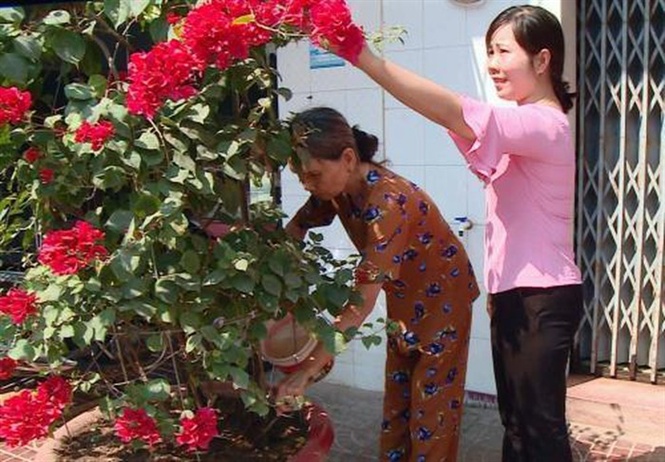 Phụ nữ xã Nhơn Phúc siêng năng chăm sóc nên những chậu hoa giấy phát triển rất tốt.