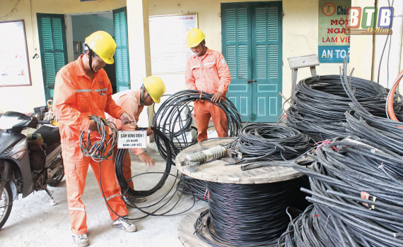 Công nhân Điện lực Đông Hưng chuẩn bị vật tư cải tạo nâng cấp lưới điện hạ áp nông thôn.