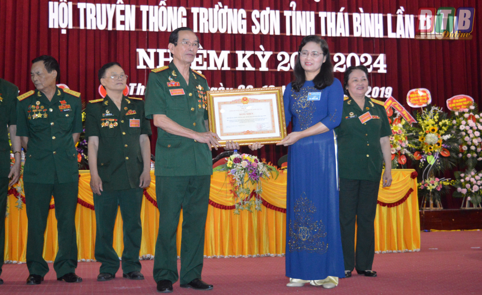 Thừa ủy quyền của Thủ tướng Chính phủ, đồng chí Nguyễn Thị Lĩnh, Tỉnh ủy viên, Phó Chủ tịch UBND tỉnh trao bằng khen của Thủ tướng Chính phủ cho Hội Truyền thống Trường Sơn - đường Hồ Chí Minh Việt Nam tỉnh Thái Bình.