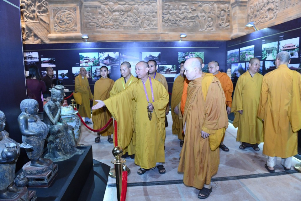 Sau nghi thức cắt băng khai mạc các sự kiện văn hóa Phật giáo, các đại biểu đã tham quan một số gian trưng bày hiện vật triển lãm độc đáo về chủ đề Phật giáo tại điện Tam Thế và điện Quan Âm.