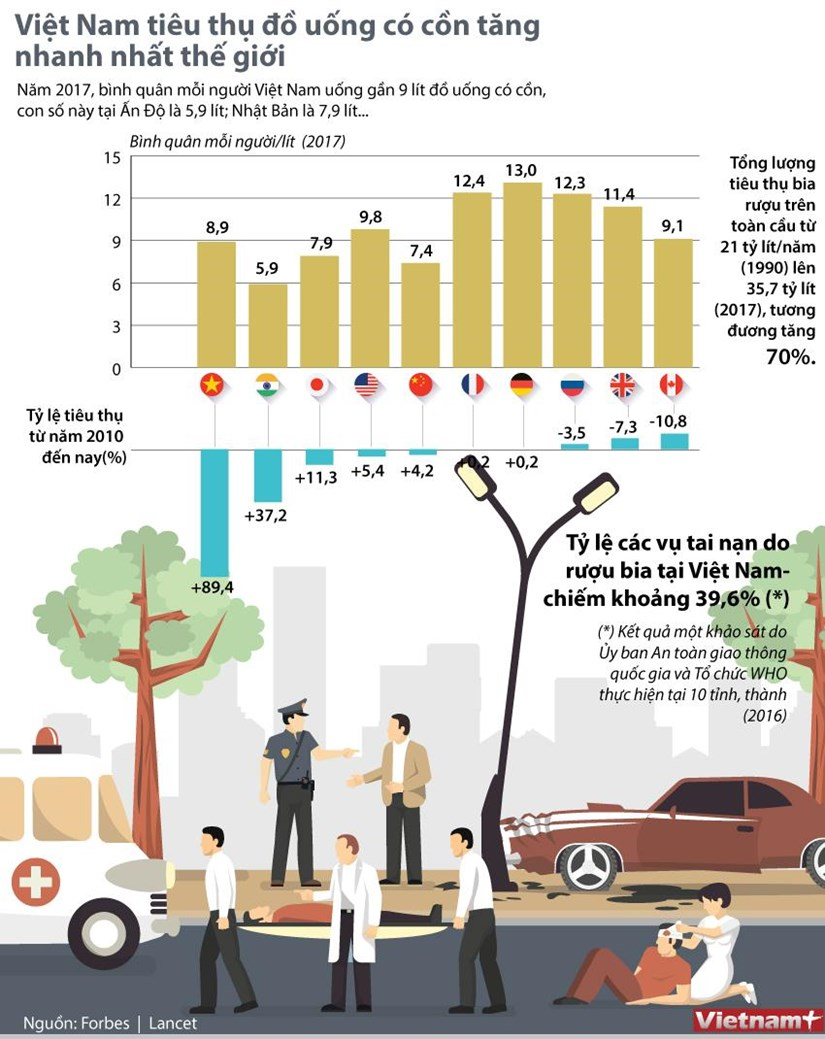 Năm 2017, bình quân mỗi người Việt Nam uống gần 9 lít đồ uống có cồn, trong khi con số này tại Ấn Độ là 5,9 lít, tại Nhật Bản là 7,9 lít.