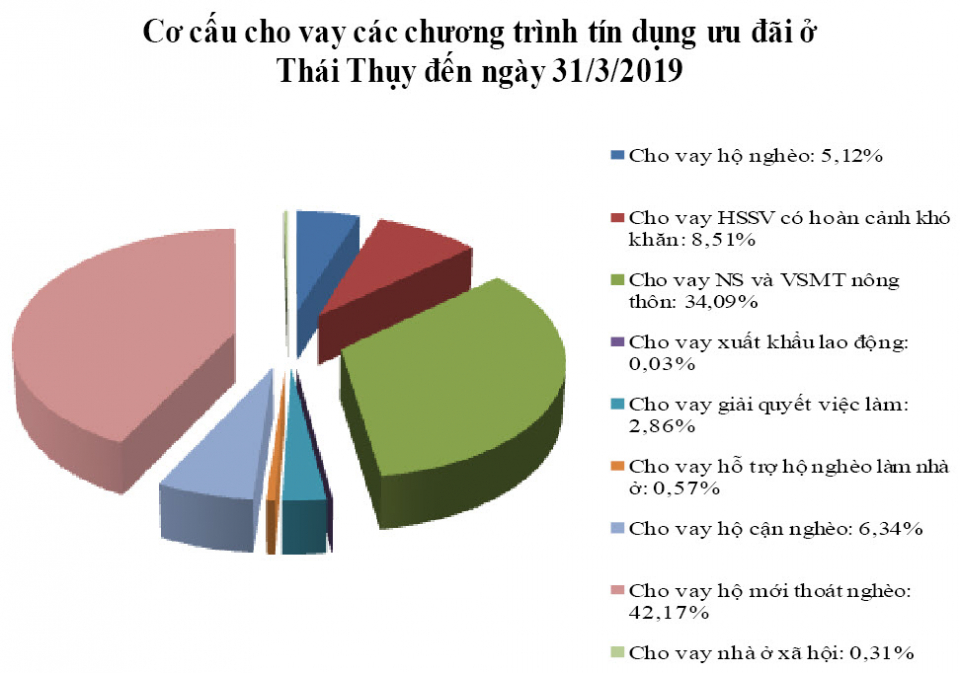 Nhờ thực hiện hiệu quả các giải pháp, chất lượng tín dụng ưu đãi trên địa bàn huyện Thái Thụy ngày một nâng cao. Đến ngày 31/3/2019, tổng doanh số thu nợ các chương trình tín dụng ưu đãi trên địa bàn huyện đạt 24,591 tỷ đồng. Nợ quá hạn chiếm 0,12% tổng dư nợ, giảm 23,2 triệu đồng so với thời điểm 31/12/2018.
