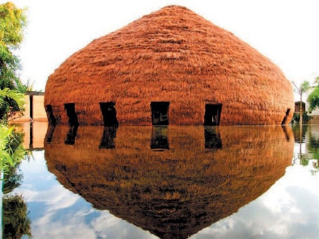 Ngôi nhà có địa thế rất đẹp, được bao quanh bởi những cánh đồng lúa, sông ngòi và rất hoà quyện với cảnh quan. Ngôi nhà có không gian thoáng đãng, cởi mở, giao hoà với thiên nhiên, đặc biệt chất liệu tre và mái rơm rạ rất phù hợp với thời tiết nóng ẩm, mưa nhiều ở một đất nước khí hậu nhiệt đới. Nước mưa sẽ trôi đi rất nhanh và nhà cũng mau ráo nước.