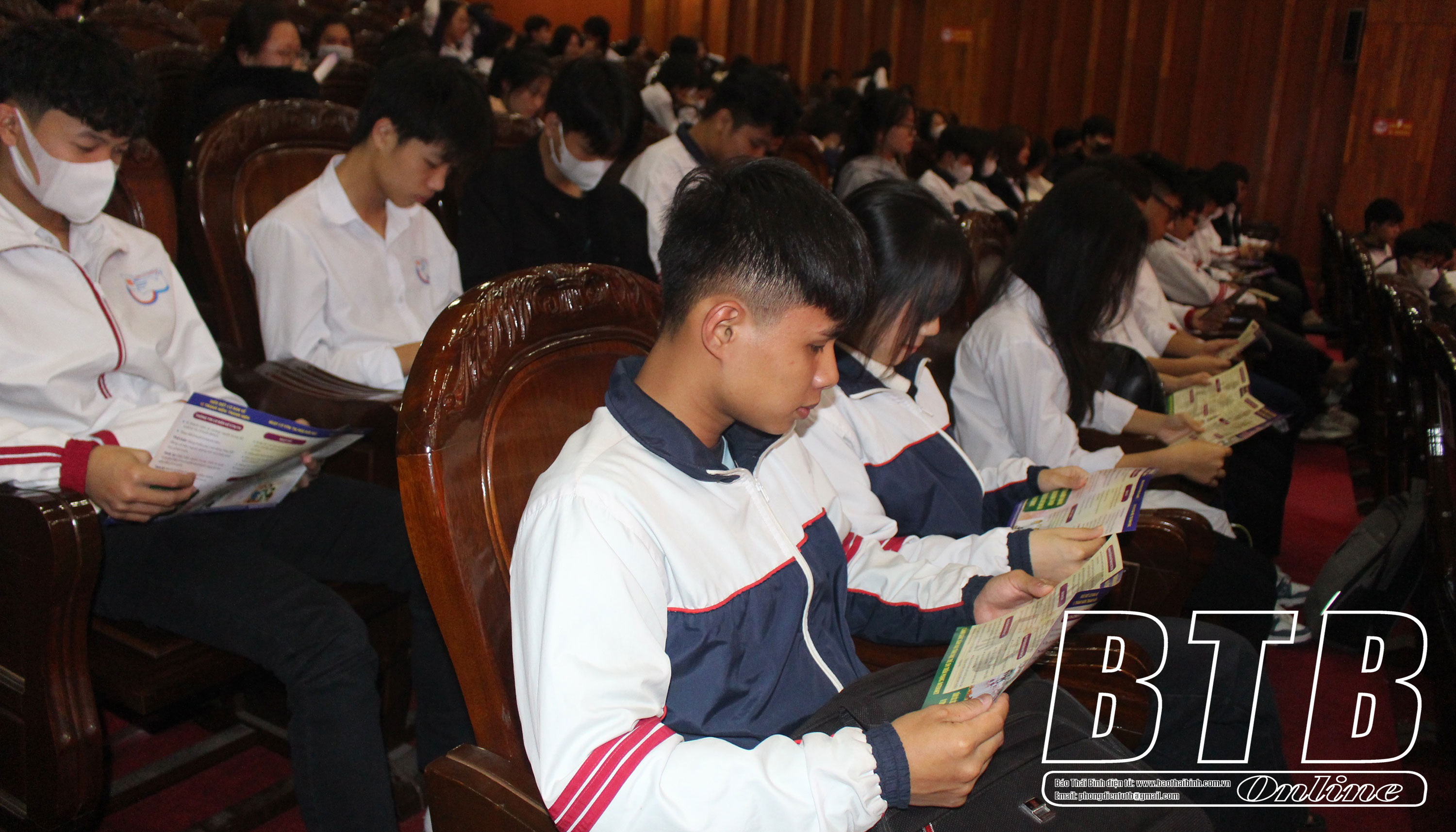 Học sinh Trường THPT Nguyễn Trãi (Vũ Thư) tìm hiểu thông tin về chăm sóc sức khỏe sinh sản vị thành niên, thanh niên, lợi ích khám sức khỏe tiền hôn nhân.