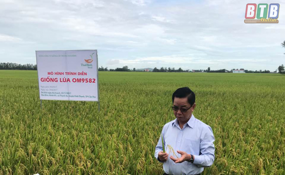 Chủ tịch Hội đồng quản trị ThaiBinh Seed Trần Mạnh Báo kiểm tra sinh trưởng giống lúa OM 9582 tại Cần Thơ (ảnh do TSC cung cấp).