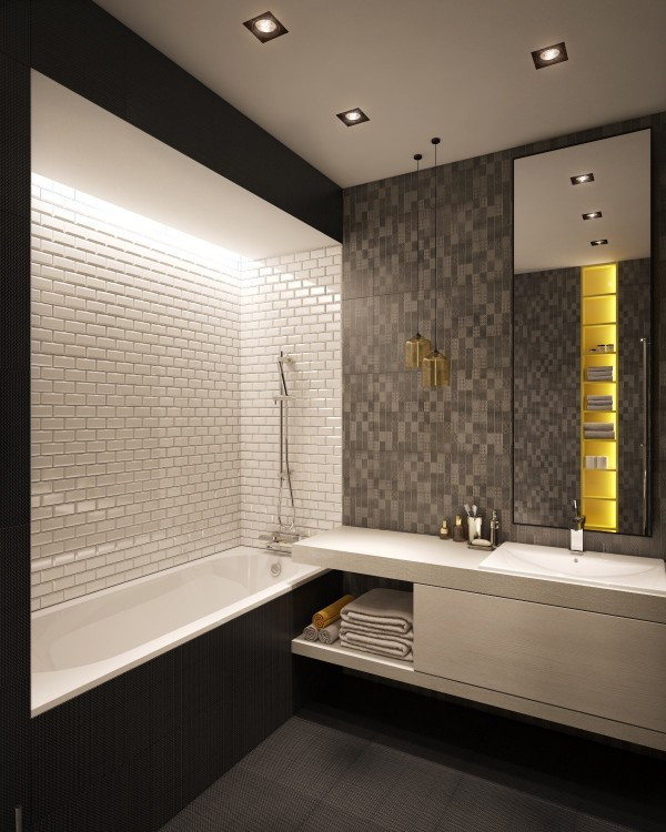 Tô điểm thêm chút màu vàng cho phòng tắm thêm sức sống và năng động hơn trong tổng thể kết cấu trắng và nâu trầm như thế này từ tường đến sàn phòng tắm.