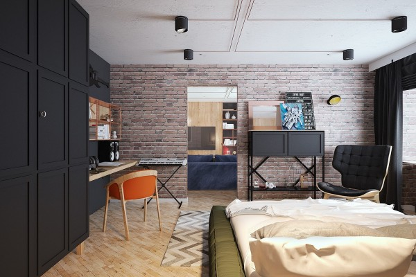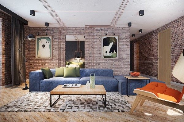 Không gian thứ hai này được kết hợp màu sắc sống động và hình ảnh vui tươi tạo ra một không gian luôn chào đón và mát mẻ ngay với nội thất tối giản của nó. Trong thiết kế này, gạch trần gần như bao trọn toàn bộ không gian. Một chiếc ghế với cấu trúc hiện đại được bọc màu cam sáng mang lại cho căn phòng nguồn năng lượng bù đắp cho màu xanh nhẹ nhàng và màu trầm của gạch trần. Những bức tranh hình con gấu bắc cực như tiếp thêm ma lực cuốn hút cho phòng khách này.