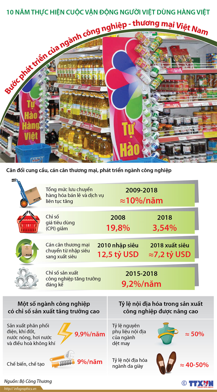 Cuộc vận động người Việt Nam ưu tiên dùng hàng Việt Nam triển khai được 10 năm đã mang lại kết quả tích cực, góp phần kiềm chế lạm phát, giảm nhập siêu, cân đối cung cầu, phát triển ngành Công Thương.
