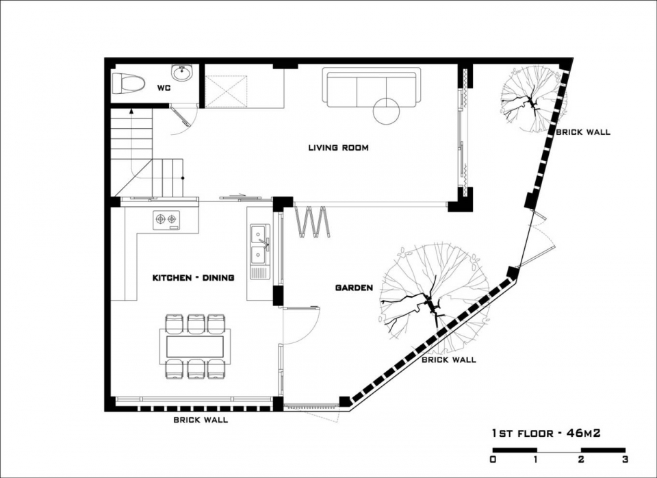 Tầng một rộng 46m2 là không gian liên thông phòng khách, phòng ăn và nhà bếp theo hình chữ L.