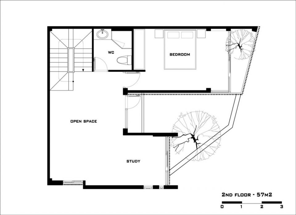 Để tăng diện tích sử dụng, tầng hai được nới rộng ra thành 57m2, với một phòng ngủ, một phòng học tập và một không gian sinh hoạt chung của gia đình.