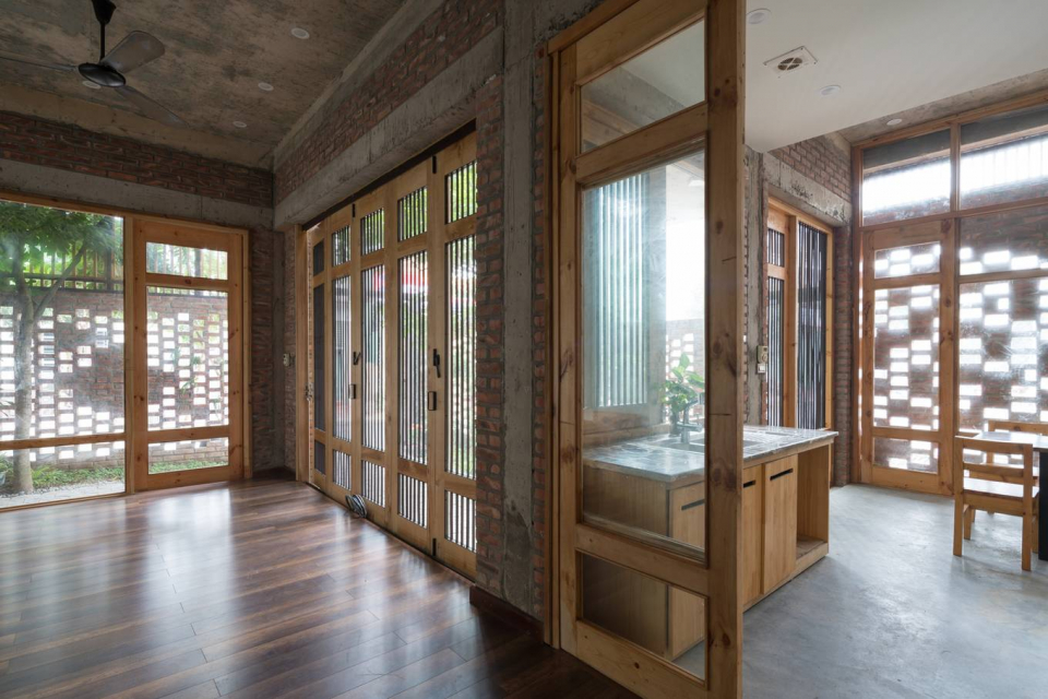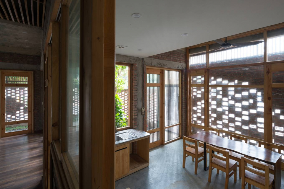 Nhờ hai lớp bảo vệ (tường gạch và cây xanh), gia chủ tự tin làm những khung cửa lớn, giúp nhà luôn thoáng đãng. Khi chủ nhà chỉ cần ánh sáng mà không muốn gió trời, các cánh cửa kính sẽ được đóng lại.