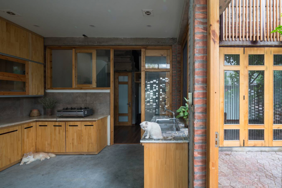 Đồ nội thất nhà bếp cũng như toàn bộ ngôi nhà sử dụng nhiều gỗ, phù hợp với nét mộc mạc của tường gạch không trát, sàn bê tông mài, hay trần bê tông thô...