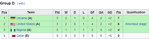 Tại bảng D, tình hình cân bằng hơn nhiều. Trước vòng cuối, cả 3 đội là U20 Ukraine, U20 Mỹ và U20 Nigeria đều có cơ hội đi tiếp.