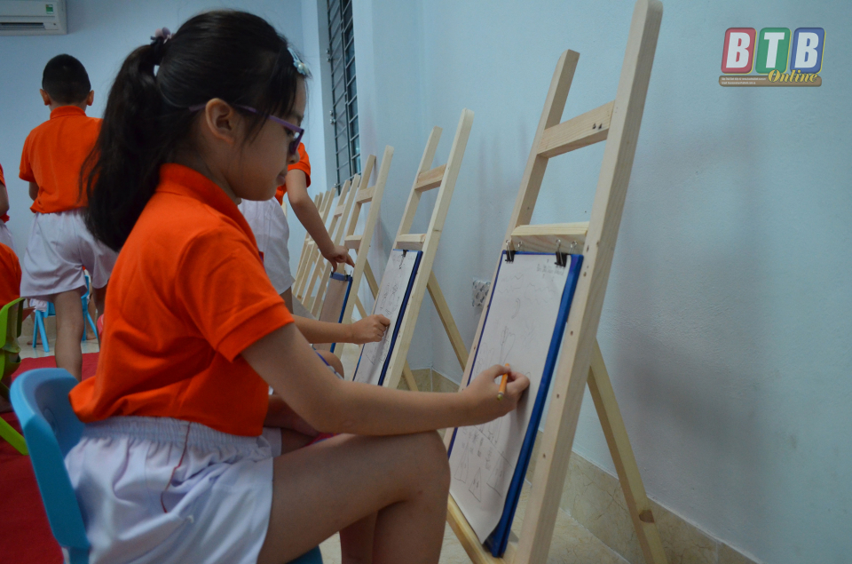 Các em học sinh của lớp năng khiếu và rèn kỹ năng sống bán trú trong giờ học mỹ thuật.