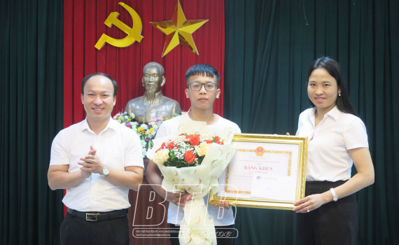 Lãnh đạo UBND thành phố Thái Bình và lãnh đạo Ban Thi đua - Khen thưởng, Sở Nội vụ trao bằng khen của Chủ tịch UBND tỉnh và tặng hoa chúc mừng anh Cao Tiến Ninh.