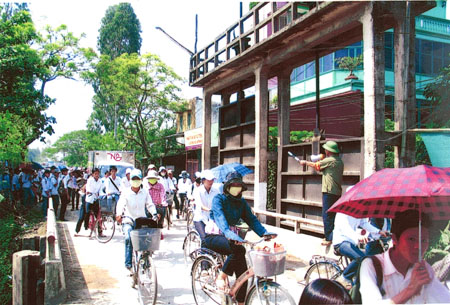 Con đường về xã Hùng Dũng tấp nập người, xe. Vừa tới Trường THPT Đông Hưng Hà, chúng tôi bắt gặp một người đàn ông ngoài 60 tuổi, tay đeo băng đỏ đang tất bật với công việc, đó chính là ông Hòe. Sau giờ cao điểm, khi học sinh chỉ còn lác đác trên đường, ông mới hoàn thành công việc để trở về nhà.