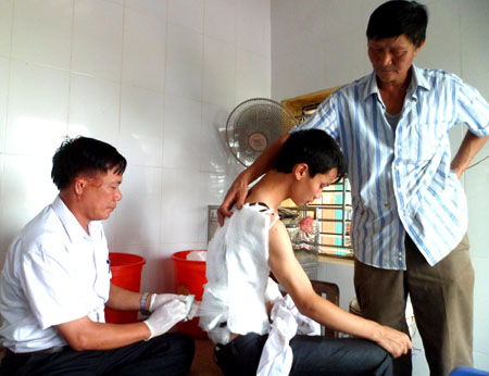 Lương y Ðào Viết Thoàn (người bên trái) chữa bỏng cho bệnh nhân tại nhà.