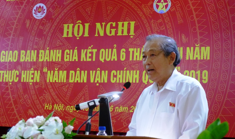 Chiều 10/6, tại Hà Nội, Ban Dân vận Trung ương phối hợp với Ban cán sự đảng Thanh tra Chính phủ và các cơ quan liên quan tổ chức hội nghị giao ban đánh giá kết quả 6 tháng đầu năm thực hiện “Năm dân vận chính quyền” 2019, trọng tâm là kết quả công tác tiếp dân, xử lý đơn thư và giải quyết khiếu nại, tố cáo, nhất là những vụ việc khiếu kiện phức tạp, đông người, kéo dài.