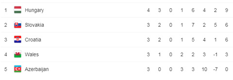 Tại bảng E, Slovakia bất ngờ leo lên ngôi nhì bảng sau chiến thắng 5-1 trước đối thủ bị đánh giá thấp hơn Azerbaijan. Trong khi đó, Xứ Wales của HLV Ryan Giggs tụt xuống vị trí thứ 4 sau thất bại 0-1 trên sân của Hungary. Như vậy, Hungary đã vượt lên dẫn đầu ở báng E với 9 điểm/4 trận.