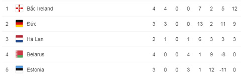Cá nhân Marco Reus (10', 37') và Serge Gnabry (17',62') đóng góp cú đúp. Còn lại những Leon Goretzka (20'), İlkay Guendogan (pen 26'), Timo Werner (79') và Leroy Sane (88') có mỗi người 1 pha lập công. Thắng tưng bừng, Đức vẫn tạm xếp thứ 2 (9 điểm/3 trận) sau Bắc Ireland - đội bóng đã chật vật đánh bại Belarus với tỷ số 1-0 để duy trì ngôi đầu bảng C (12 điểm/4 trận).