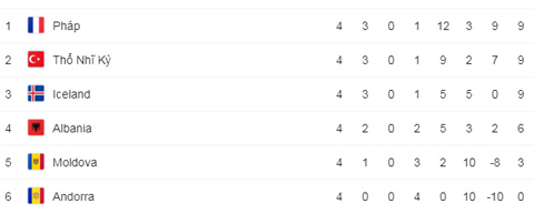 Trong khi đó, Thổ Nhĩ Kỳ lại bỏ qua cơ hội tuyệt vời để chiếm lấy ngôi số 1 bảng H khi thất thủ 1-2 trước Iceland. Như vậy tại bảng đấu này, có 3 đội cùng được 9 điểm nhưng Pháp tạm dẫn đầu.
