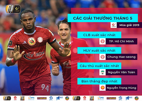 BTC giải V.League 2019 đã công bố các giải thưởng của tháng Năm. Giải thưởng được căn cứ trên màn trình diễn của các đội bóng, cầu thủ trong 3 vòng đấu 8, 9 và 10.
