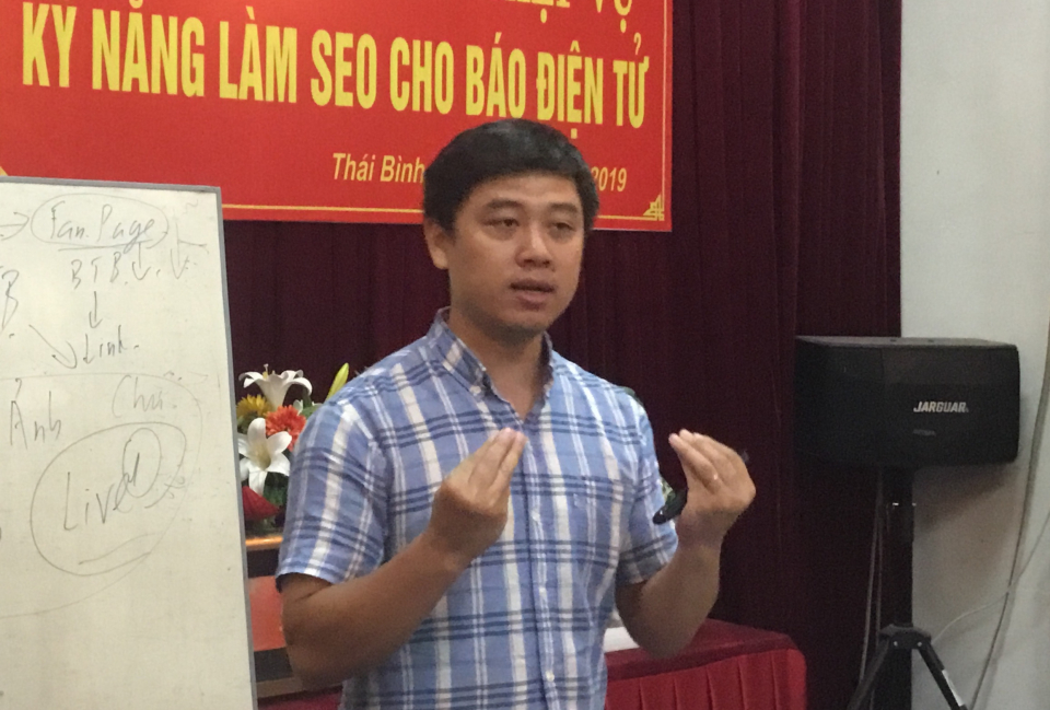 Đồng chí Vũ Anh Thao, Tỉnh ủy viên, Tổng Biên tập Báo Thái Bình, Chủ tịch Hội Nhà báo tỉnh phát biểu tại lớp bồi dưỡng nghiệp vụ kỹ năng làm SEO.