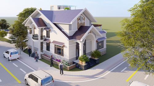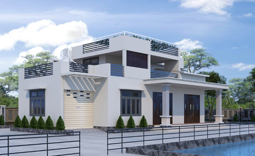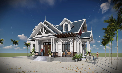 Trong ảnh là mẫu thiết kế phù hợp với cả nông thôn, thành phố, nhà có diện tích 110m2, 4 phòng ngủ, mái xanh dương nổi bật.