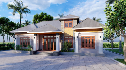 Mẫu nhà cấp 4 diện tích 120m2, 3 phòng ngủ, hành lang rộng, cây xanh trồng khéo kéo xung quanh, tao nên không gian sống sang trọng, phóng khoáng.