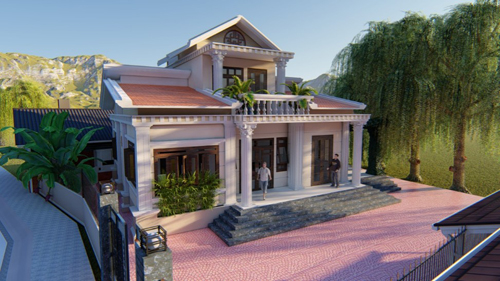 Ngôi nhà diện tích 220m2 với 3 phòng ngủ do Kisato thiết kế cho gia đình anh Dũng, huyện Hương Sơn, Hà Tĩnh theo phong cách tân cổ điển, đồ sộ, nguy nga. Mái, cột nhà, bậc thang,... toát lên vẻ sang trọng.