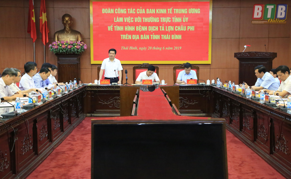 Kết luận buổi làm việc, đồng chí Cao Đức Phát, Ủy viên Trung ương Đảng, Phó Trưởng ban thường trực Ban Kinh tế Trung ương ghi nhận và đánh giá cao công tác phòng, chống bệnh dịch tả lợn châu Phi của tỉnh thời gian qua. Đồng chí nhấn mạnh: Các cấp ủy, chính quyền từ tỉnh đến cơ sở đã chủ động vào cuộc từ sớm, chỉ đạo quyết liệt, sâu sát và đồng bộ; huy động sự vào cuộc của cả hệ thống chính trị trong phòng, chống dịch bệnh. Tuy nhiên, đồng chí cũng lưu ý đây là dịch mới, chưa có vắc xin phòng bệnh, gây ảnh hưởng lớn đến kinh tế người chăn nuôi nên tỉnh phải sẵn sàng phương án đối phó bệnh dịch tả lợn châu Phi bùng phát trở lại bất cứ lúc nào. Vì vậy, đồng chí đề nghị trong thời gian tới, tỉnh cần tiếp tục tập trung phòng, chống dịch. Tổ chức rút kinh nghiệm đề ra giải pháp hiệu quả phù hợp với từng giai đoạn phát triển của dịch bệnh. Cần tiếp tục tuyên truyền phổ biến cho nhân dân hiểu rõ về dịch bệnh. Có cơ chế chính sách hỗ trợ người chăn nuôi bị thiệt hại do bệnh dịch tả lợn châu Phi. Tăng cường nhân lực, vật lực phòng, chống dịch bệnh. Có biện pháp hỗ trợ, giúp đỡ người chăn nuôi duy trì đàn lợn ở những nơi chưa bị dịch; tạo điều kiện để người chăn nuôi tiêu thụ lợn khỏe mạnh. Kịp thời có giải pháp tạo sinh kế cho dân, duy trì và phát triển kinh tế cho địa phương. Qua buổi làm việc với lãnh đạo tỉnh và chuyến khảo sát thực tế tại huyện Vũ Thư, Đoàn có thêm kinh nghiệm thực tiễn để đối phó với dịch bệnh, đồng thời các ý kiến của địa phương là cơ sở quan trọng để Đoàn đánh giá, báo cáo Ban Bí thư Trung ương và đề xuất Chính phủ các chính sách, giải pháp phù hợp tháo gỡ khó khăn cho bà con nông dân.